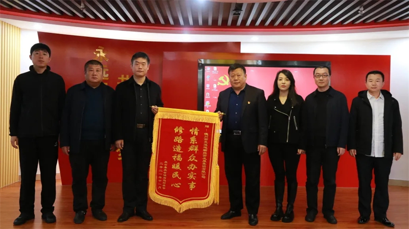 11月6日,庆云县庆云镇党委副书记张瑞琦一行到交投集团赠送锦旗。集团党委委员马文洪、人力资源部部长尹哲、综合办公室主任李宁陪同。